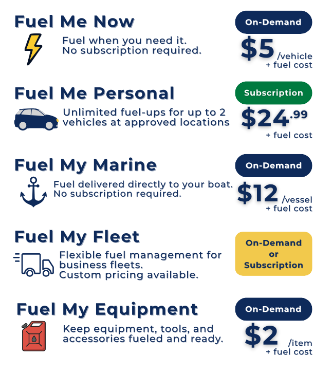 | Name | Fuel Me Now | Fuel Me Personal | Fuel Me Marine | Fuel Me Fleet | Fuel My Equipment |